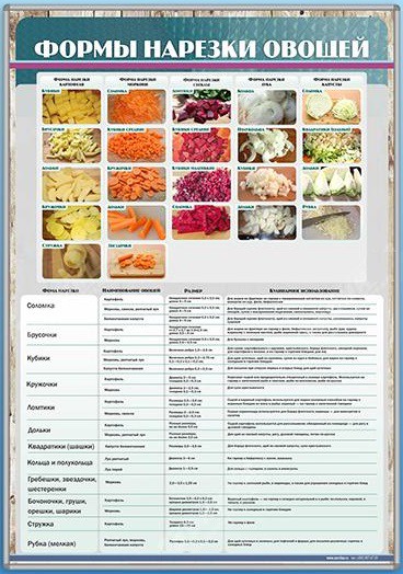 На стенде изображены основные формы нарезки овощей (картофеля, моркови, свеклы, лука, капусты), их размеры и кулинарное использование.
