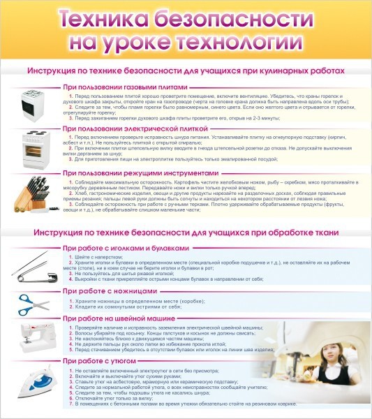 В будущем каждой девочке предстоит заниматься женскими делами, которые потребуются для будущей ее семьи и детей. Стенд «Техника безопасности на уроке технологии» обучает юных школьниц, как себя обезопасить во время приготовления пищи, как обращаться с утюгом, какие меры предосторожности необходимы при роботе на швейной машинке, как пользоваться режущими и острыми предметами и многое другое, которое также необходимо запомнить. Стенд выполнен в ярких красках с небольшими картинками, что позволяет более точно понять всю технику безопасности и не нанести себе травму при исполнении женских обязанностей.