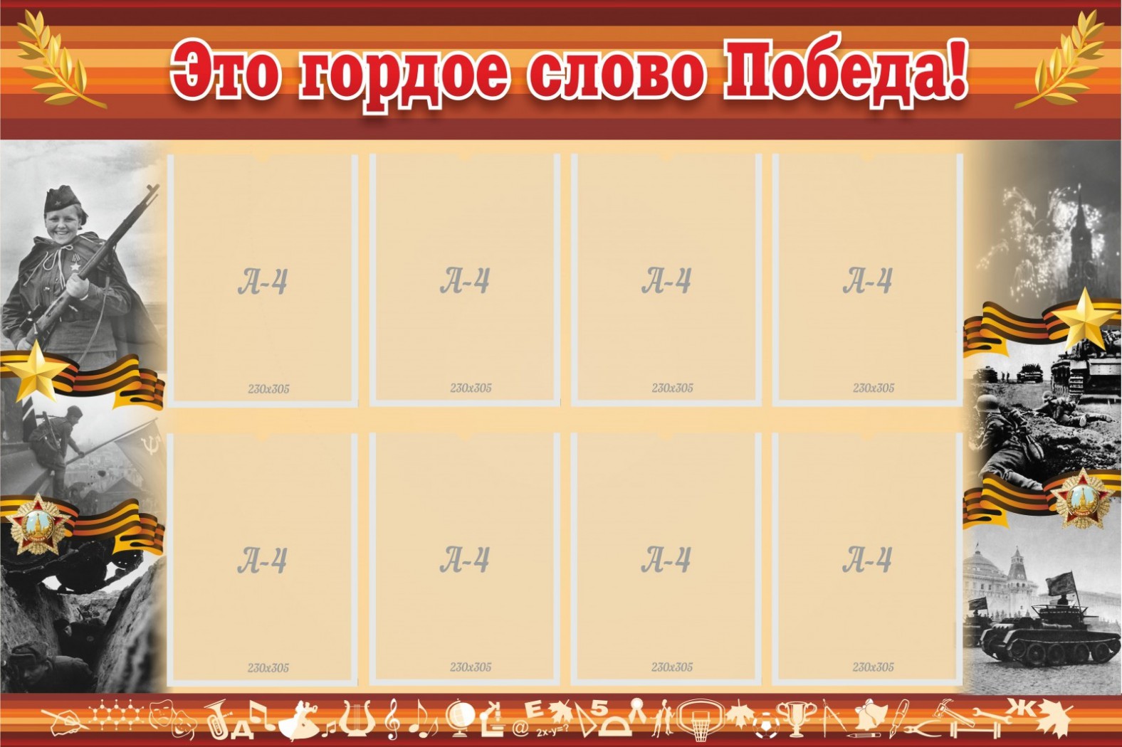 Каждый должен помнить о таком великом слове, как Победа. День, когда наши дедушки и бабушки отвоевали нашу будущую жизнь и наш мир над головой. Теперь ничто, и никто не будет забыт на таком красивом стенде, посвященному Дню Великой Победы. Большой горизонтальный стенд имеет красивые изображения моментов того Великого Дня. Качественная печать таких изображений не позволит им стираться и выгорать, а наличие Георгиевских лент придает стенду боевой дух и праздничную атмосферу. На стенде имеются 8 карманов, для размещения тематической информации. Пластиковый лист ПВХ, из которого сделан стенд, достаточно легкий, поэтому стенд можно легко установить.
