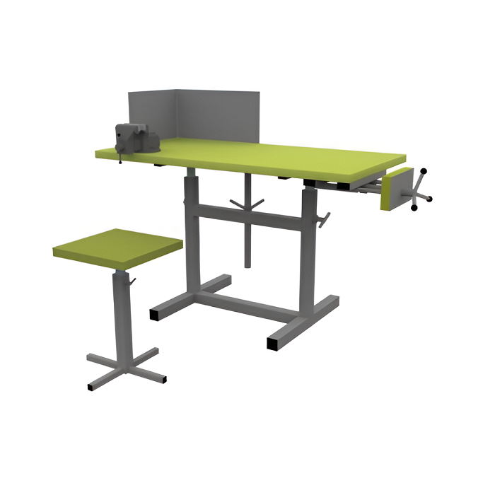 Верстак - вариант на стандартном подверстачье, изготовленный из металлического профиля 40х40 мм. Порошково-полимерная покраска RAL 5005. Столешница выполнена из влагостойкой берёзовой фанеры 27 мм и покрыта лаком на водной основе. Используется для обучения основам слесарного и столярного дела. Удобен в настройке и эксплуатации для любого возраста и роста учащегося.