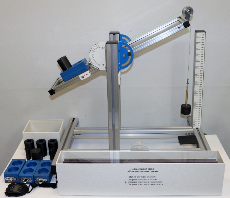 Лабораторный стенд «Проверка законов трения» предназначен для определения коэффициентов трения скольжения и покоя при различных сочетаниях материалов соприкасающихся тел.