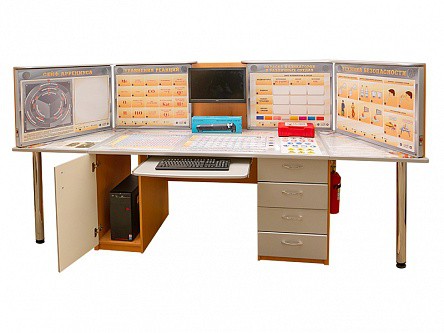 При помощи элемента управления должно выбираться правильное действие в заданной ситуации. При этом индикаторы интегрированные в стенд, должны отражать правильность выбранного ответа, загораясь зеленым и красным светом. Выбранный пункт должен отмечаться светодиодной подсветкой и должен сопровождаться подробным голосовым описанием "Виртуального учителя", который должен рассказывать о правилах техники безопасности в кабинете. Громкость "Виртуального учителя" должна изменяться при помощи сенсорного регулятора громкости, расположенного на лицевой стороне стенда.