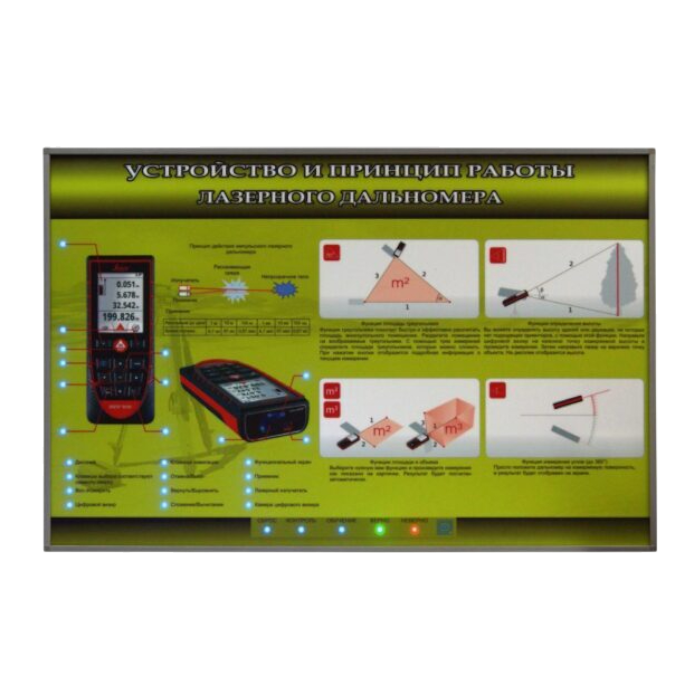Электрифицированный стенд представляет собой информационную панель с раздельной световой индикацией. На стенде представлена информация об устройстве и принципе работы лазерного дальномера, а также о его основных конструктивных элементах. В конструкцию учебного оборудования интегрированы магниточувствительные сенсоры для управления стендом при помощи интерактивного воздействия приемо-передающих устройств. Предусмотрено два режима работы со стендом: "Обучение" и "Контроль".