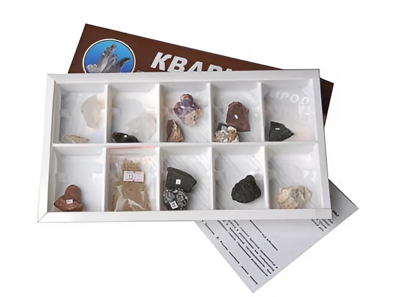 Пособие комплектуется руководством по эксплуатации и ламинированным вкладышем, содержащим информацию о свойствах, разновидностях и применении кварца.