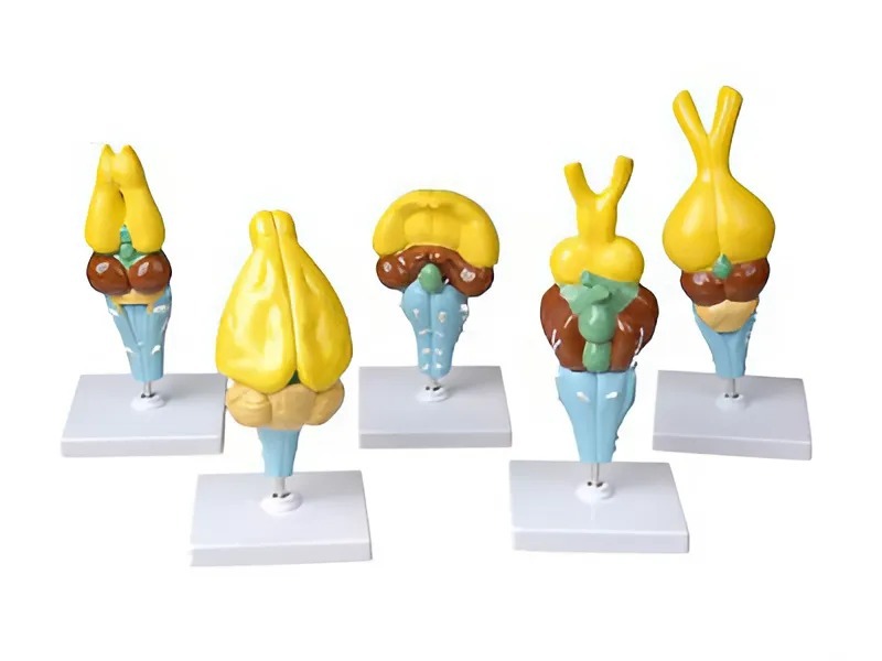 Комплект состоит из 5 моделей головного мозга позвоночных животных. Модели демонстрируют внешнее строение головного мозга позвоночных.  Для удобства на моделях отделы мозга обозначены контрастными цветами.