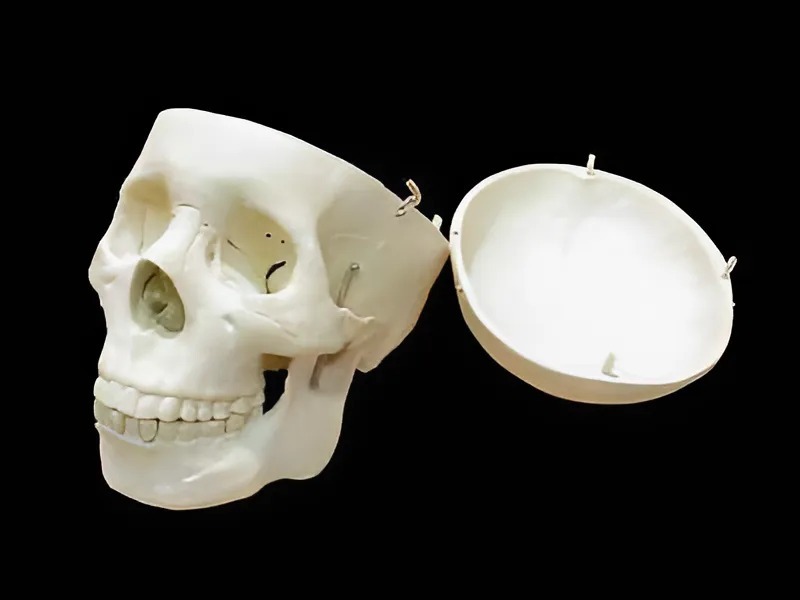 Модель является разборной, позволяет продемонстрировать расположение костей как снаружи черепа, так и внутри черепной коробки.