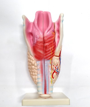 Модель разборная, высота не менее 25 см, изготовлена из пластмассы и установлена на подставку. Модель отображает сагиттальный разрез гортани человека, что позволяет рассмотреть следующие детали строения: - хрящевой надгортанник; - щитовидный хрящ; - голосовая щель; - голосовые связки.