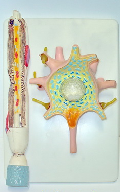 Модель неразборная, цветная, изготовлена из пластмассы и установлена на подставке. На подставке закреплены две детали: первая имитирует строение нервной клетки, вторая – строение нервного отростка (аксона). Модель нервной клетки состоит из 4 элементов: собственно тела нейрона с отростками, прозрачной ядерной оболочки и 2 шариков, имитирующих ядрышки. На ней можно рассмотреть особенности внешнего и внутреннего строения нейрона: ядро, ядрышки, пористую ядерную оболочку, секреторные образования, оболочку клетки, короткие ветвящиеся отростки с «шипиками» - дендриты, аксонный холмик – место отхождения длинного отростка нейрона (аксона). Модель аксона демонстрирует его внешнее и внутреннее строение и позволяет увидеть толстую миелиновую оболочку отростка, клетки Шванна, синтезирующие миелин, перехваты Ранвье, митохондрии и секреторные образования, образуемые клетками в период возбуждения.