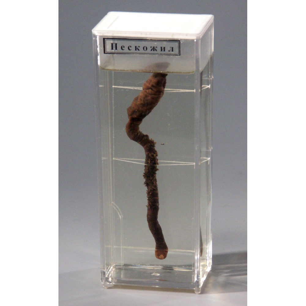Препарат смонтирован на стеклянной пластине, которая помещена в сосуд с консервирующей жидкостью. Пластина закреплена в пазах сосуда и крышки. Сосуд герметично закрыт. На препарате представлен пескожил - является представителем типа кольчатые черви, класса многощетинковые черви, семейство пескожилы, вид морской пескожил.