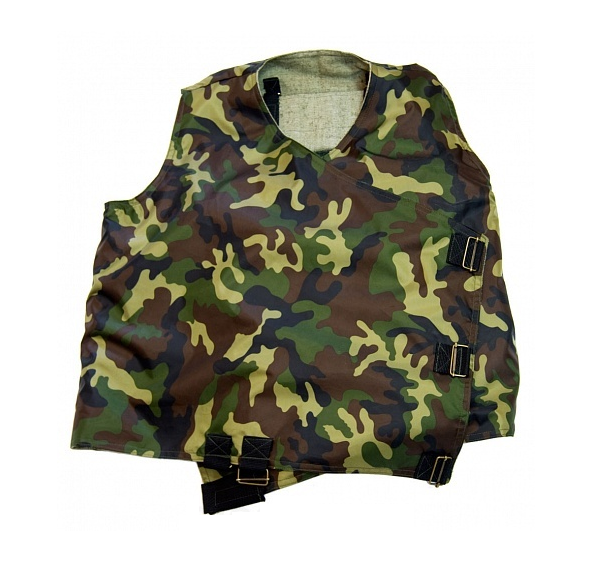 Жилет изготовлен из смесовой ткани защитного цвета с карманами под грузы.