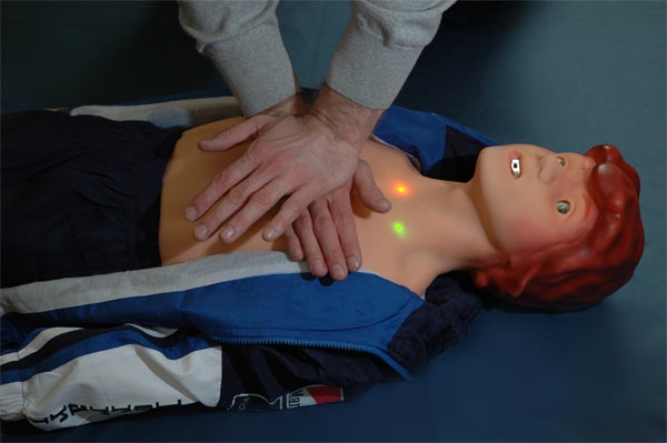 - при достаточной силе и глубине нажатий непрямого массажа сердца появляется пульсовая волна на сонной артерии, и загорается оранжевый индикатор на грудной клетке тренажера;